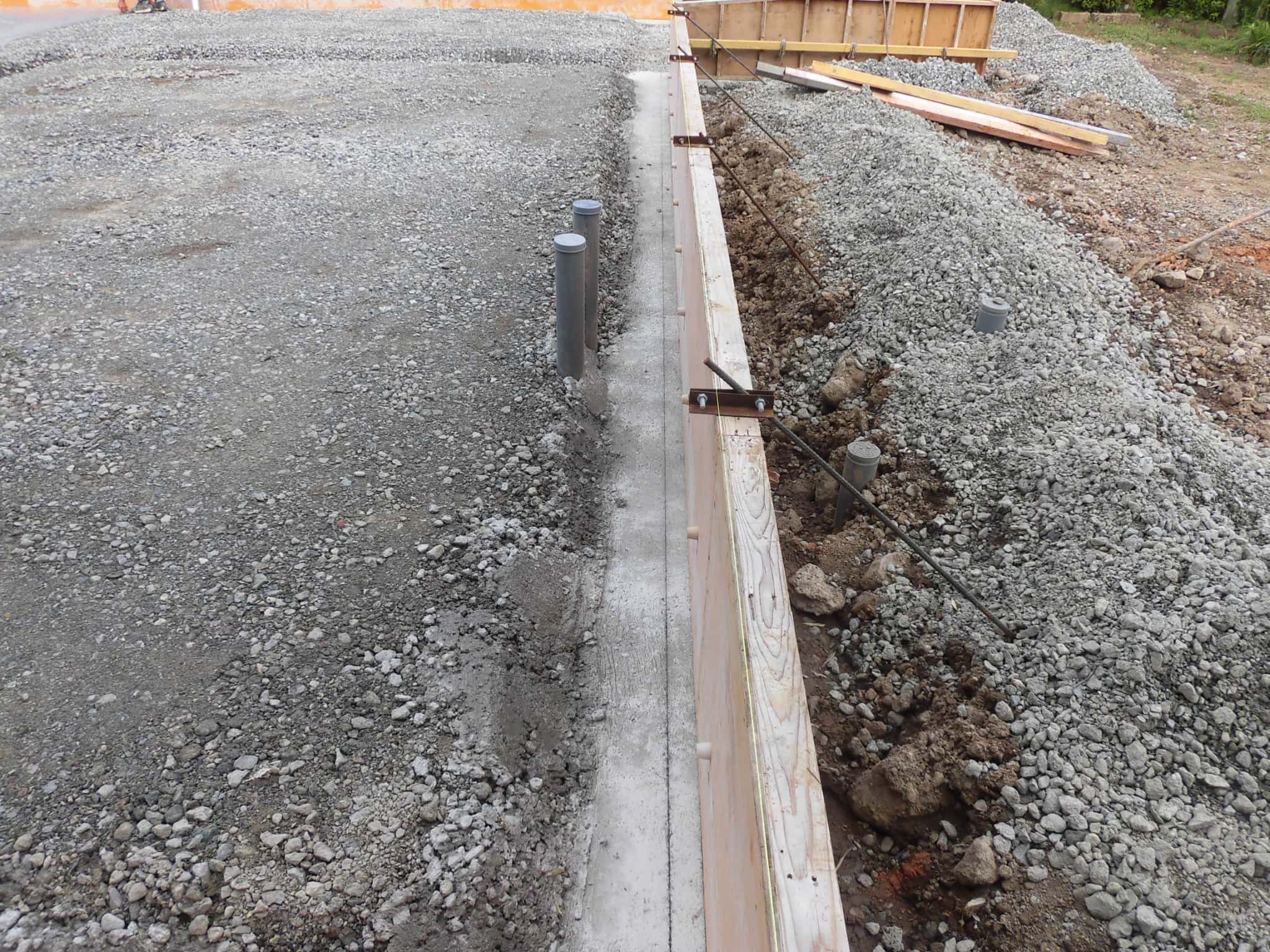墨出しというわけですから、墨が付くところじゃないとダメですが、普通は「捨てコンクリート」という上に墨を出します。現場に入る職人さんは、この「墨」を頼りに仕事をします。なので、墨を間違えば、そのまま施工が間違うことになります。まぁ、職人さんがその間違いに気が付くこともあるんですが、大きく違えばわかりますが、1cm、2cmのことであれば墨を信じて仕事をすることになります。ちなみに、うちの現場は施工中も「オープン」にしてますので、ご近所の方や学校帰りの子供たちなんかが現場を除くこともあります。以前あったのは、墨出しのときに寸法の足し算などを捨てコンクリートに書くんですが、