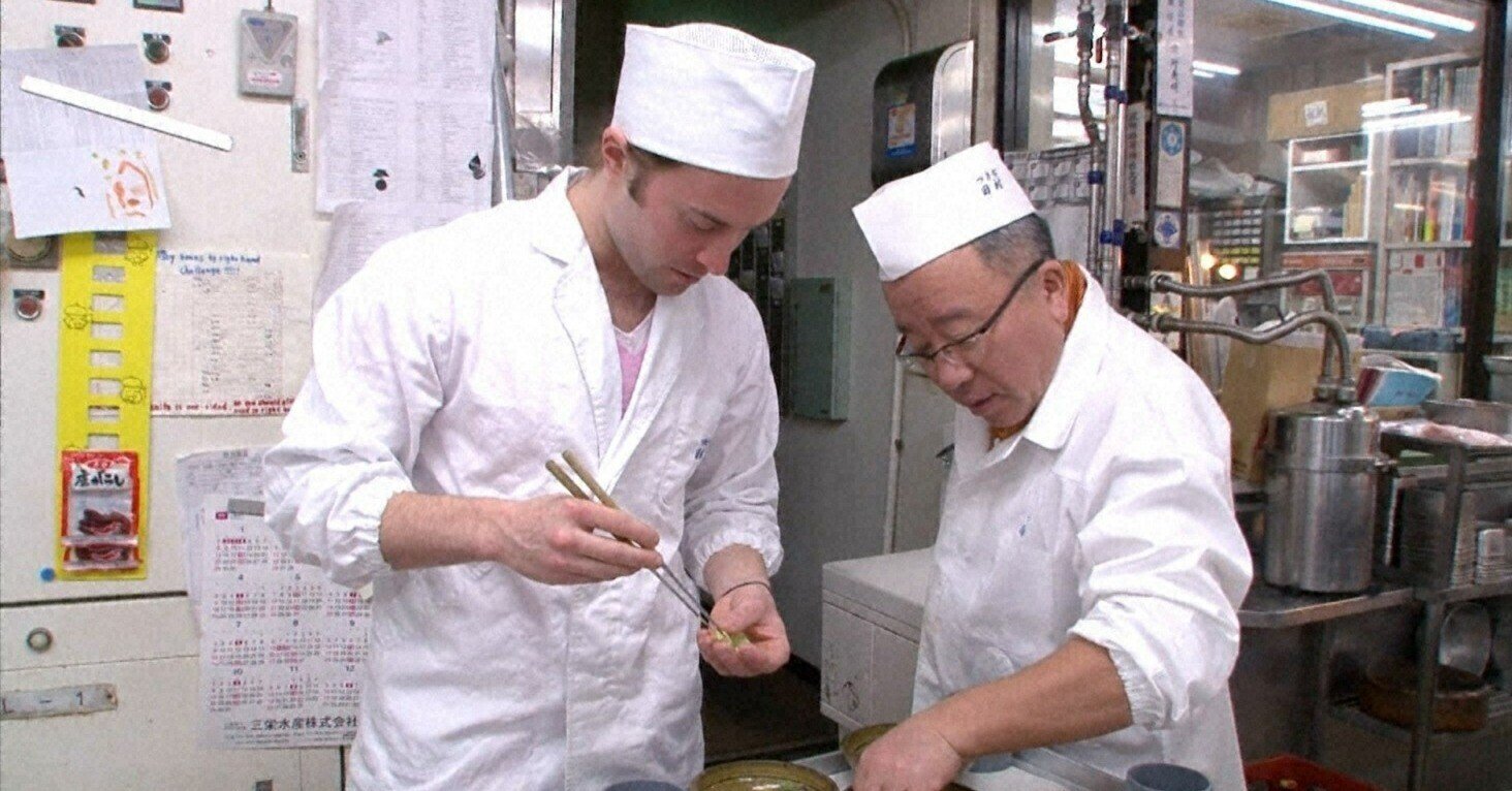 この修行風景をリポートしているのですが、和食の真髄を学ぶということで、ごく基本的な「和包丁」の使い方から学んでいく様子や、左利きなフレデリックに対して、右利き用の包丁を使わせるために右利きの訓練と称して、100粒の豆を左の皿から右に移すタイムを毎日計ることで訓練したりと、ガチな修行の様子も放送されてました。