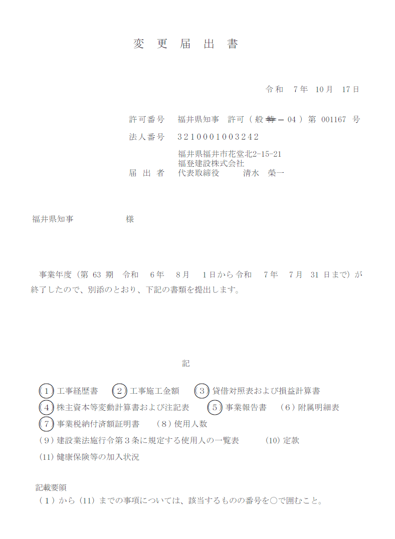 画像は、建設業法での「事業年度経過後の変更届出書」の鏡です。結構なボリュームになります。1年間でどれだけの完成工事になったのか?その現場名、場所などの一覧と金額を書く必要があり、さらに、直近3年分の推移も書けという書類を求められます。そして「財務諸表」の提出も求められます。以前は決算書をコピーして付けたんですが、所定の書式に沿って書けと言われるようになったので、決算書から財務内容を転記する形をとっています。また、「事業報告書」ということで任意形式なんですが、1年を振り返った経営的な報告書の提出を求められます。