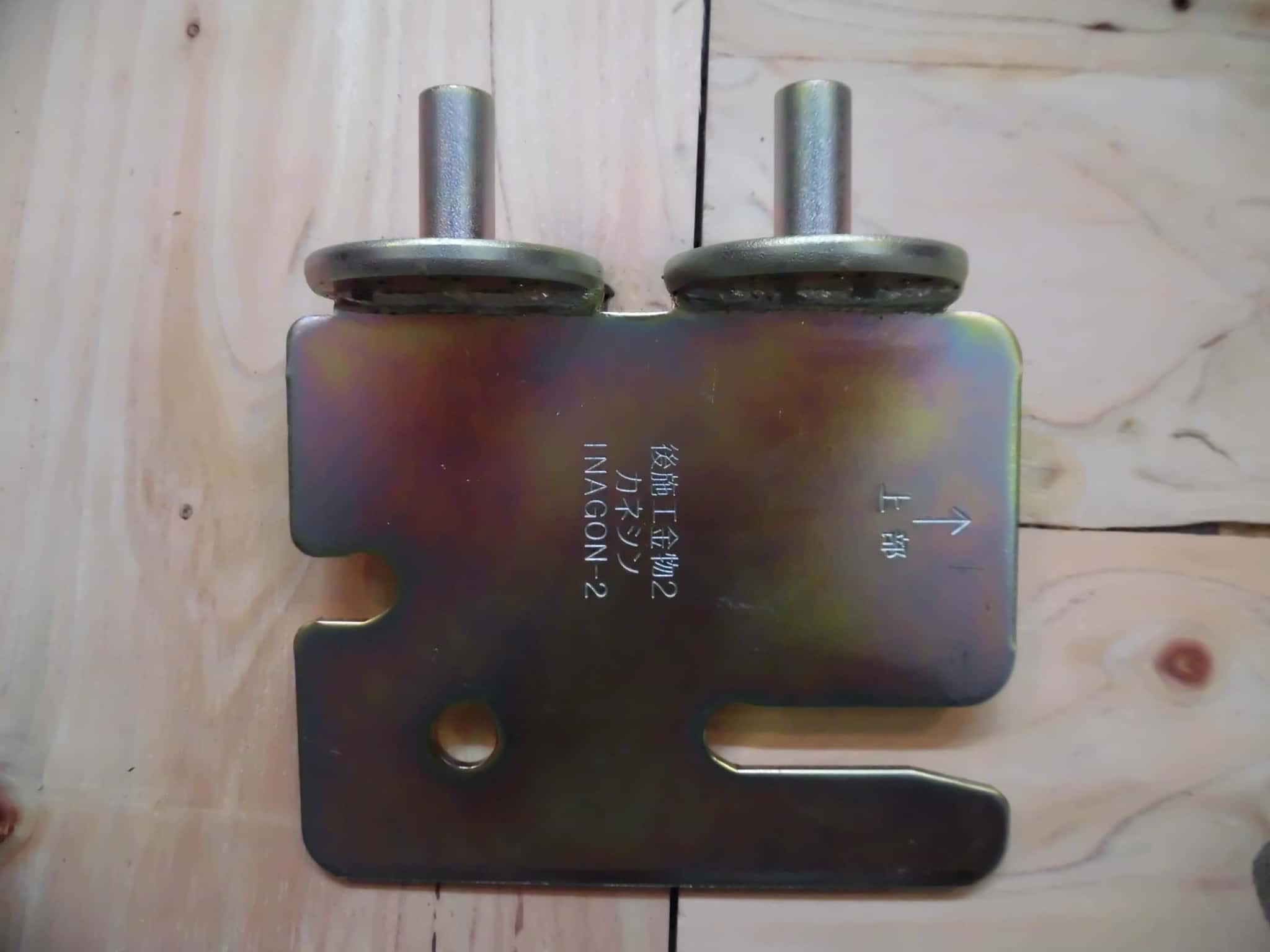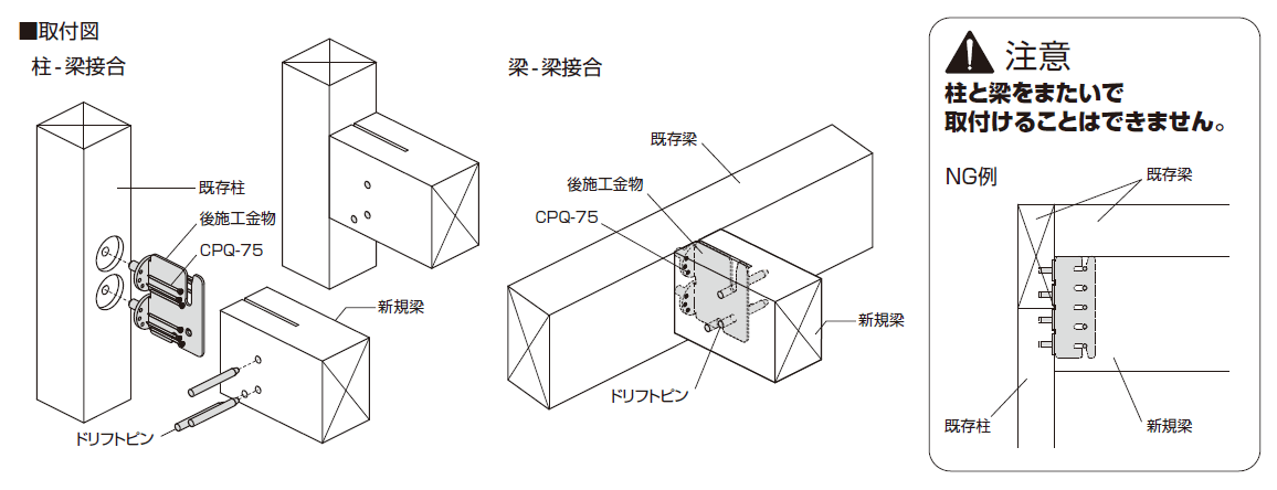 梁を受けるためのプレートを既存の梁や柱に取付、新設する梁をドリフトピンで留めるという金物です。現物はこんな感じです。