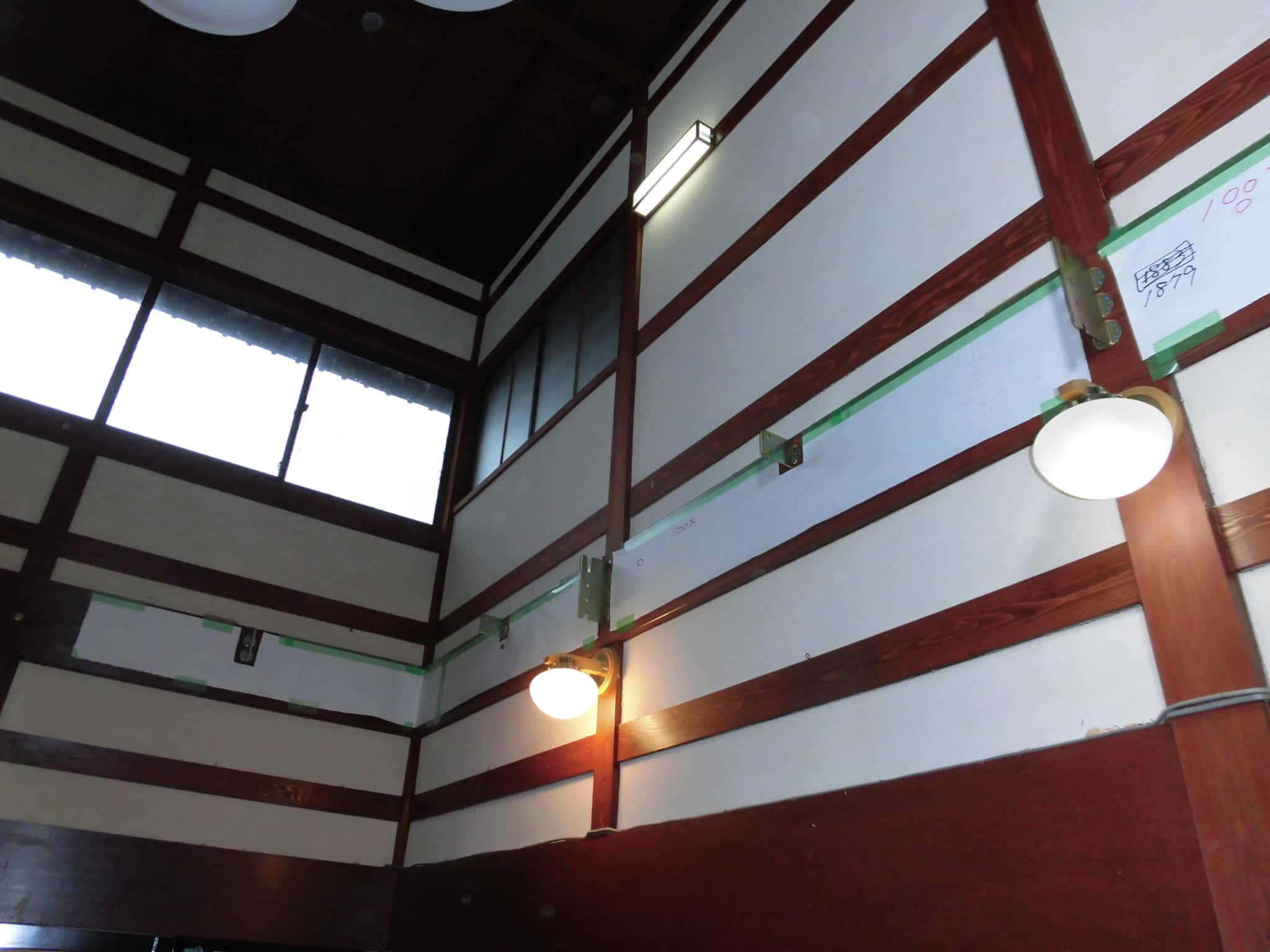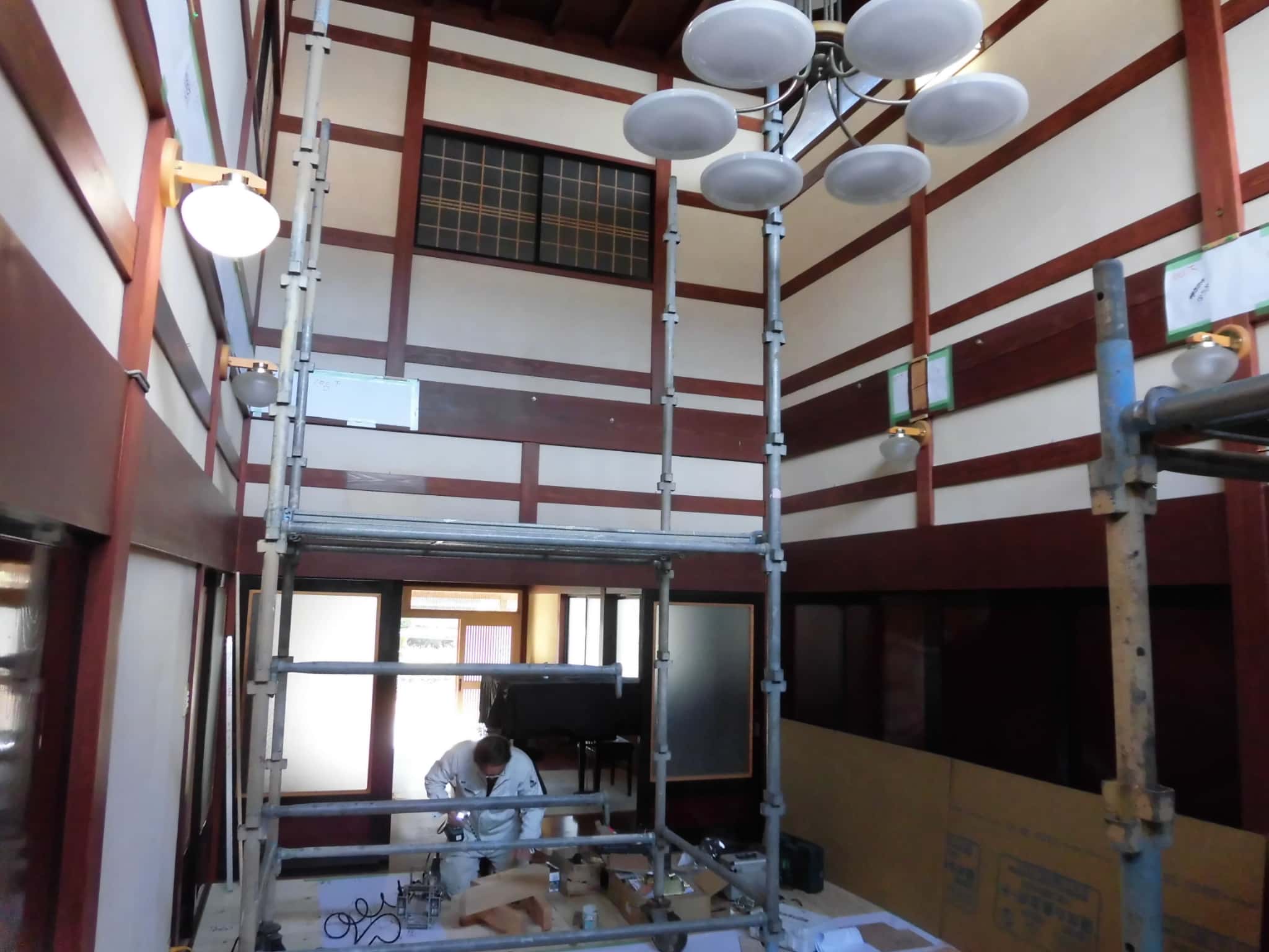 作業にあたり、吹抜け空間にはローリングタワーによる足場を設置し作業の効率をアップさせました。