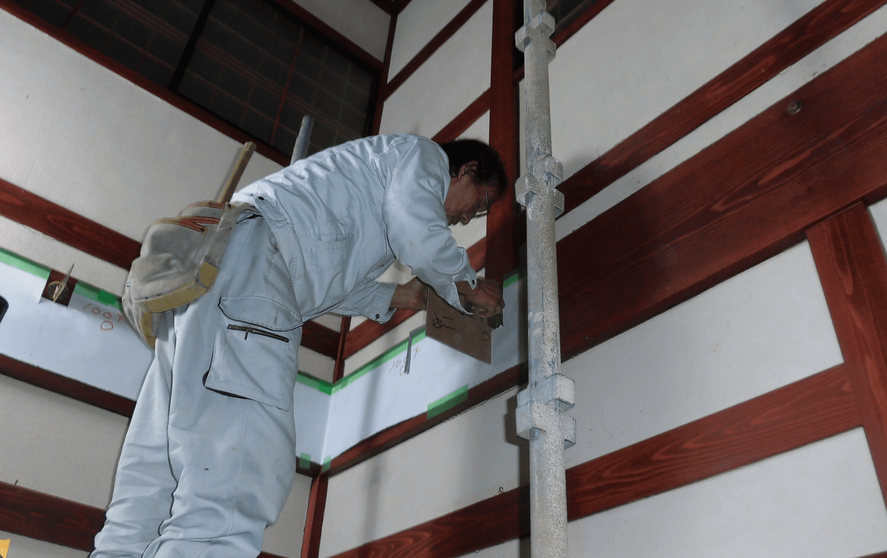 床には養生のために「構造用合板」を敷き込むことで、ローリングタワーのタイヤのめり込みにも備えました。ローリングタワーは足場にタイヤをつけたもので自由に移動ができるので、特に室内の高所作業には向いています。今回、これを2基用意して、ローリングタワーをブリッジのように配置して上部に滑車をつけて梁を吊り上げようという目論見もありますw まぁ、こうした工夫を現場、現場で考えていくことで合理的な施工が可能になるわけです。