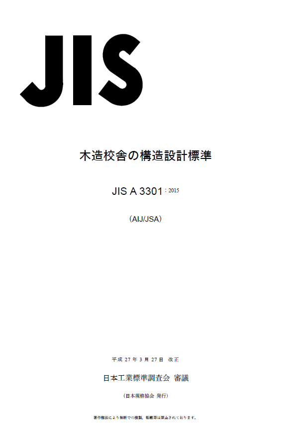 という歴史的経緯があり、法律として「工業標準化法」が施行されることにより、従来の規格が「日本工業規格(JIS)」に切り換えられ廃止され、昭和31年、木造学校建物の構造標準について規定した日本工業規格「JIS A 3301 木造学校建物」に制定されました。