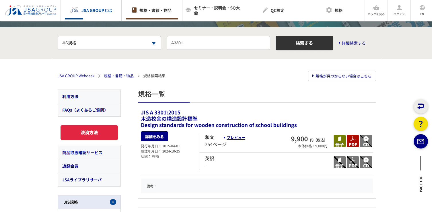 ワーキンググループの報告書はPDFで公開しているのですが、そもそものJIS A 3301については、閲覧はできるもののPDFや書籍での入手はできません。そうなれば購入となりますが、これがこんな感じで、