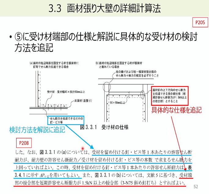 この「いろいろある」が現場での不測の事態の対応には重要で、物理的に納まりが悪い場合の改善策などをその場で指示できたり、新築だけではなく耐震改修などのリフォーム工事などでの補強での措置などのヒントにもなるのです。以前から注目していた「ビス」による施工も今回の改訂から採用されていますので、その根拠となる計算式や考え方を理解することで、構造面でのコストパフォーマンスを高めることが可能になるわけです。