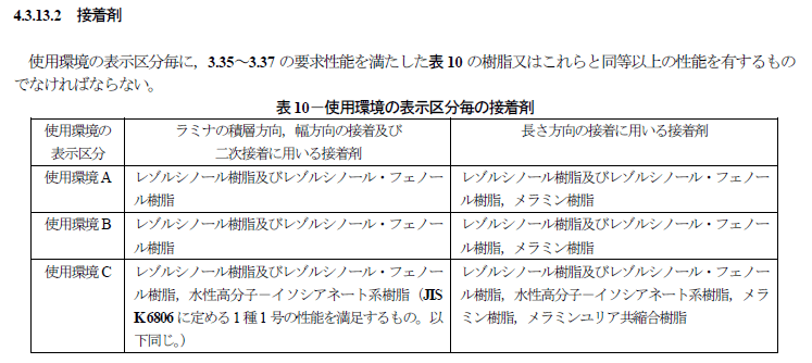 ちなみに、「4.3」は構造用集成材を指します。4.3.15.2では使用環境A~Cに対して用いられる接着剤の品質が定義されていますが、この「使用環境」は以下の通り規定されています。