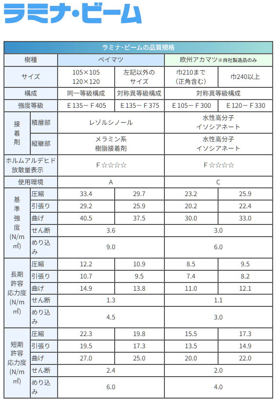 「ラミナビーム」の品質規格の中ほどに、使用環境が示されています。ベイマツ樹種の場合、使用環境Aですが、欧州アカマツの場合、使用環境Cです。強度の問題は別として、例えばE105-F300程度の梁を欧州アカマツで設計したとすると、梁が使用される箇所は「使用環境C」に限定されるというわけです。