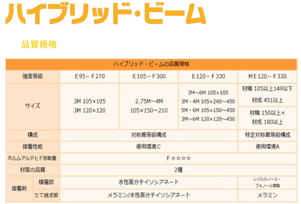 そして、この「構造用集成材」は各集成材メーカーさんが作ってくれるものを使うわけですが、設計の際には想定した「使用環境」に対応するものをオーダーすることになります。具体的な例として、弊社が県産材の集成材以外で使用する「中国木材製集成材」の「ラミナビーム」と「ハイブリッドビーム」についてご紹介します。