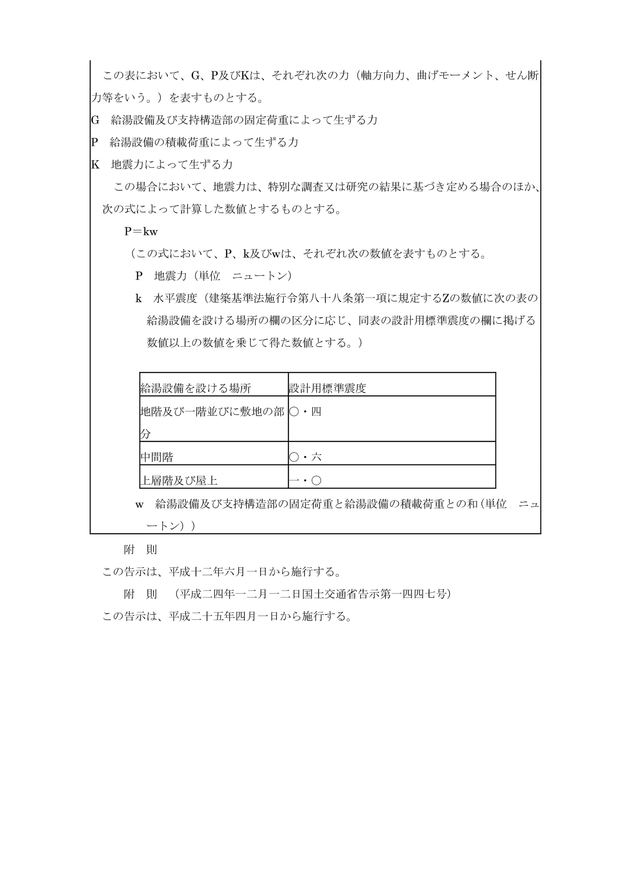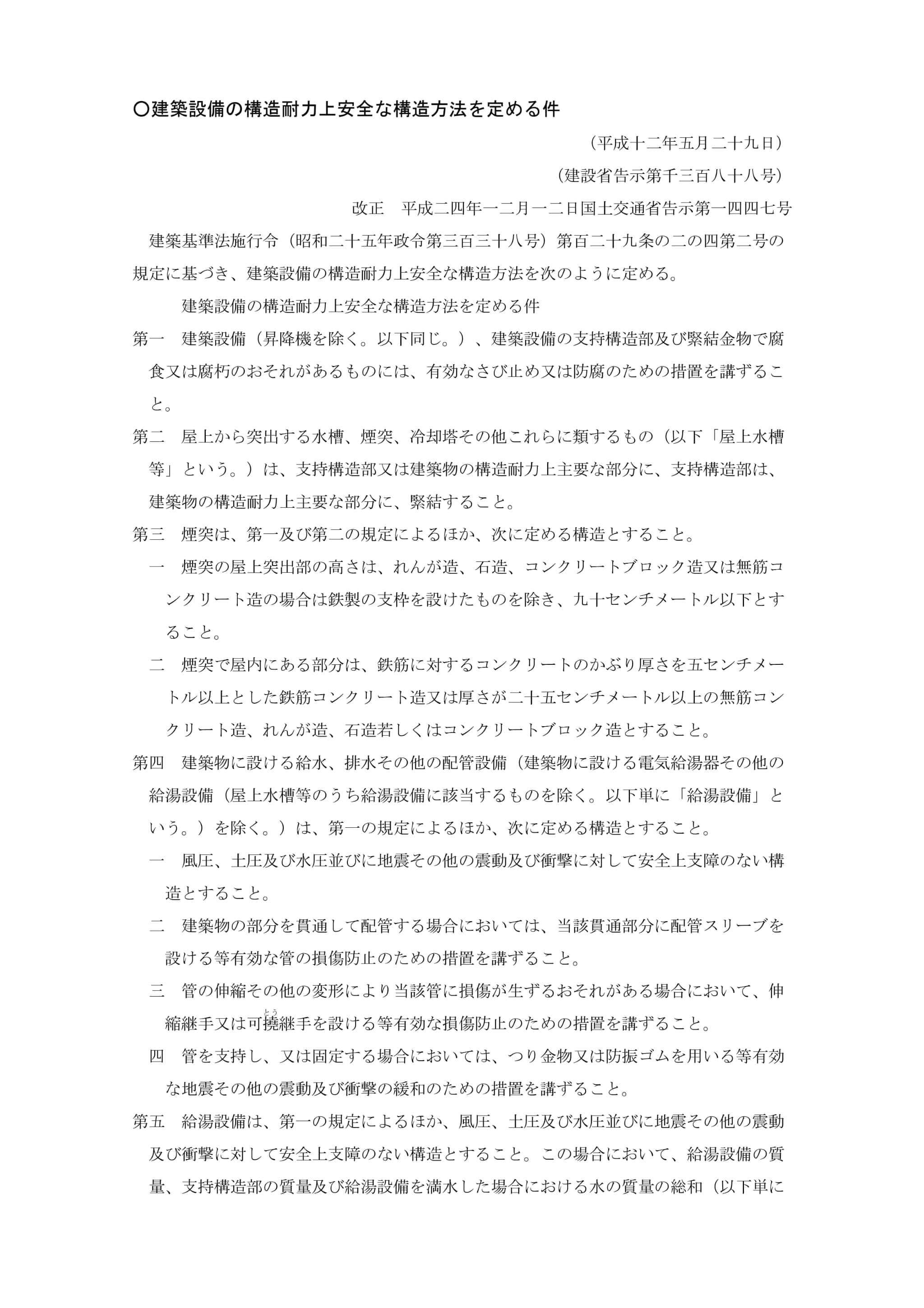 さて、この「給湯設備の固定方法」ですが、建設省告示第1388号の改正で、平成24年12月12日国土交通省告示第1447号の「建築設備の構造耐力上安全な構造方法を定める件」で、きっちり定められた規定ですw プロでも知らないなんていうので、全文公開しておきますwww