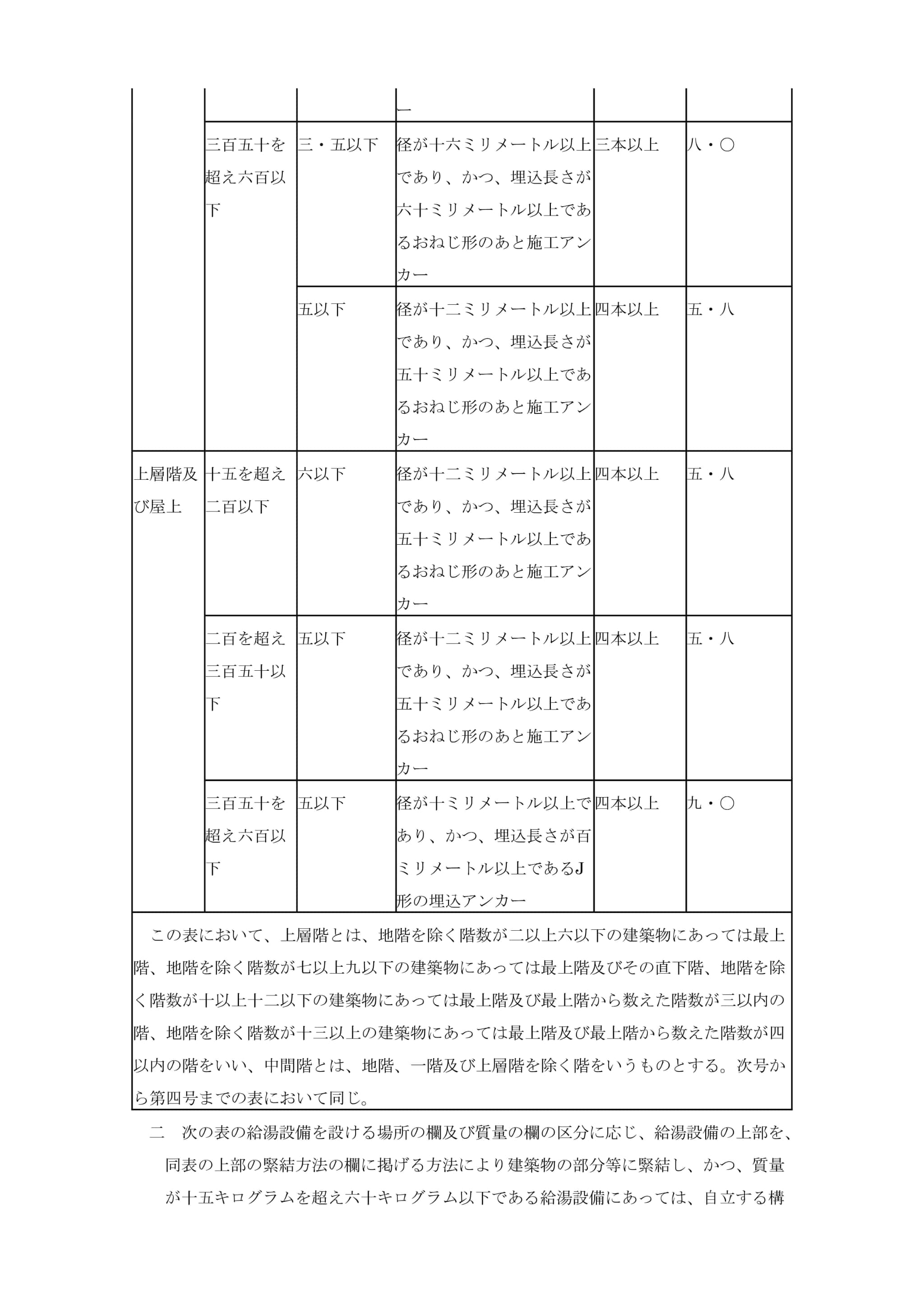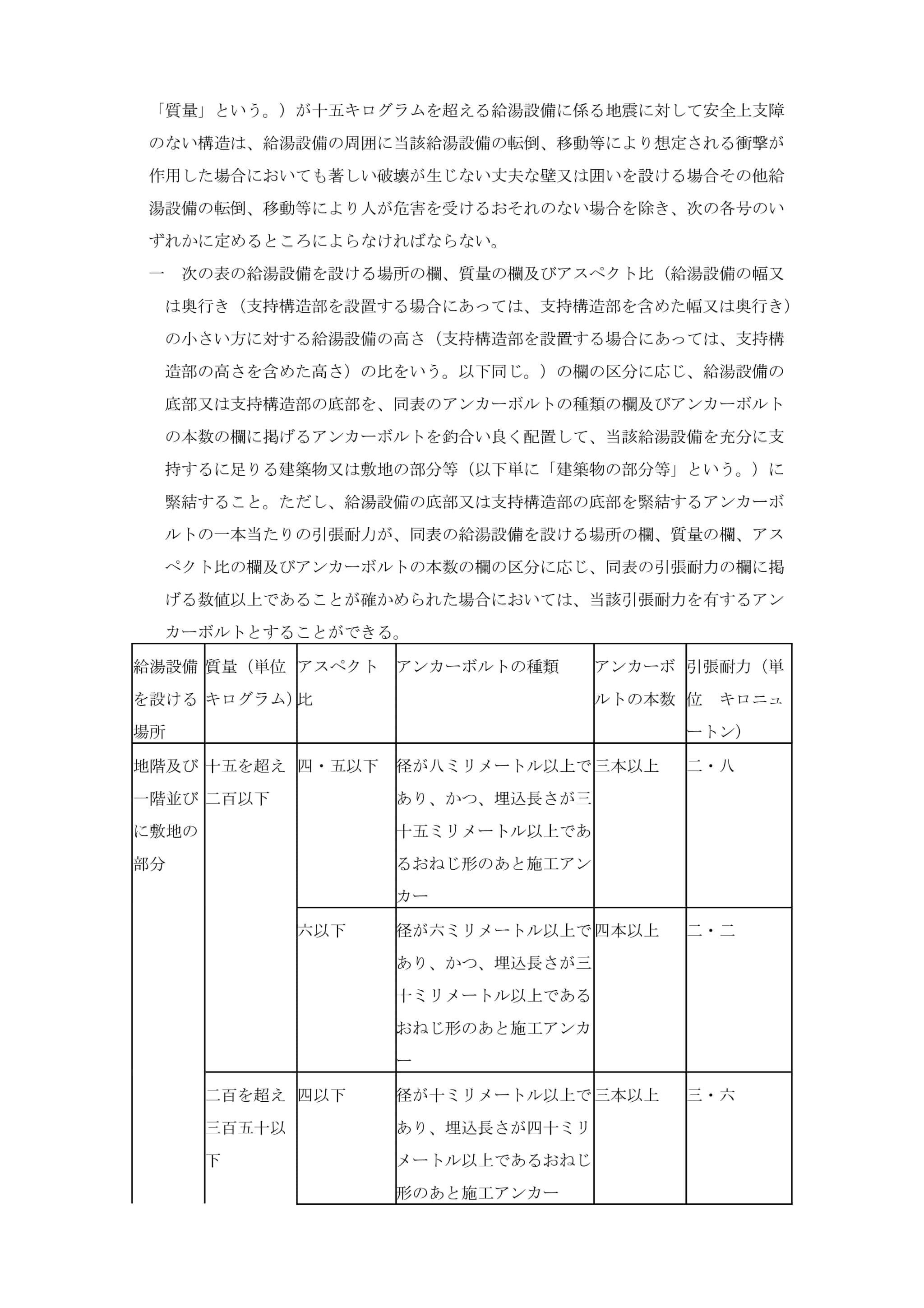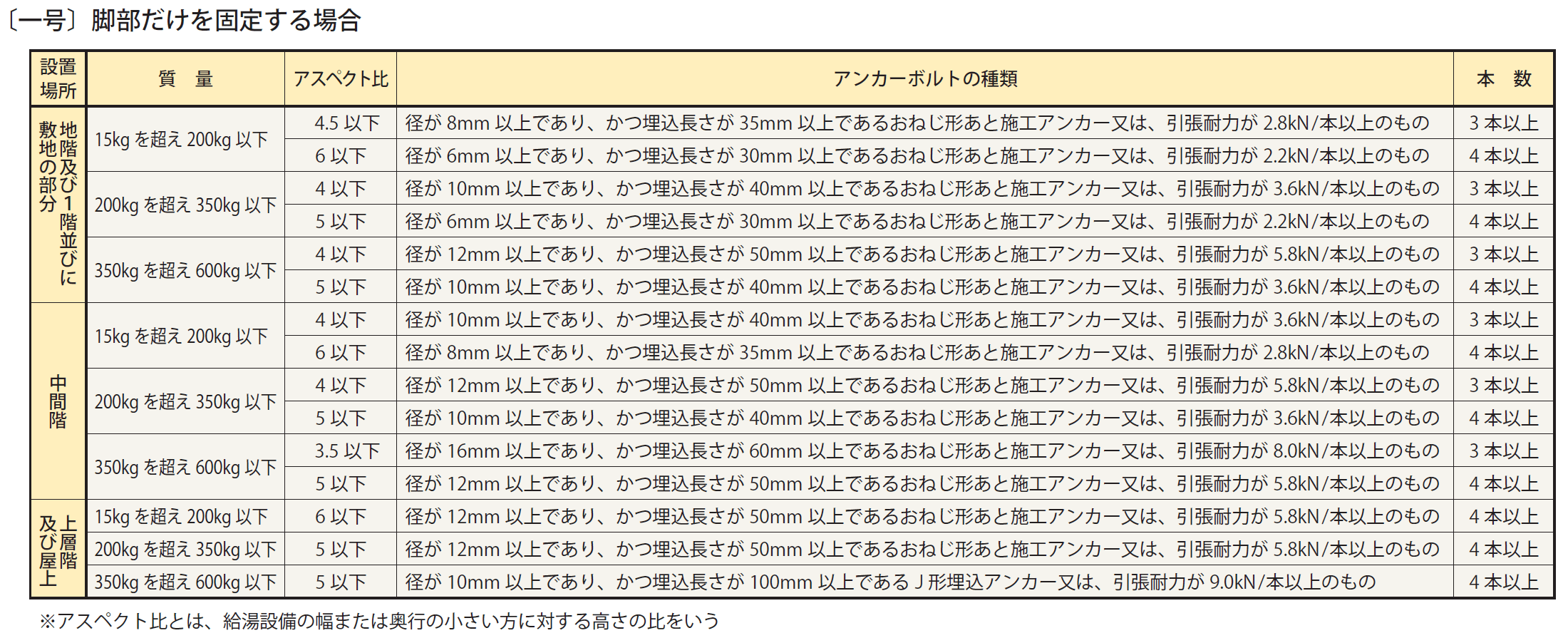 給湯器の質量とアスペクト比によって規定される「アンカーボルト」の種類と本数を規定しています。アスペクト比とは、給湯器の幅と奥行きの小さい方に対するもう一方の比です。ここで重要なのは質量なんですが、これは機器本体の質量ではなく、お湯が満載になった時の質量です。また、設置場所によっても必要なアンカーボルトの種類や本数が違います。