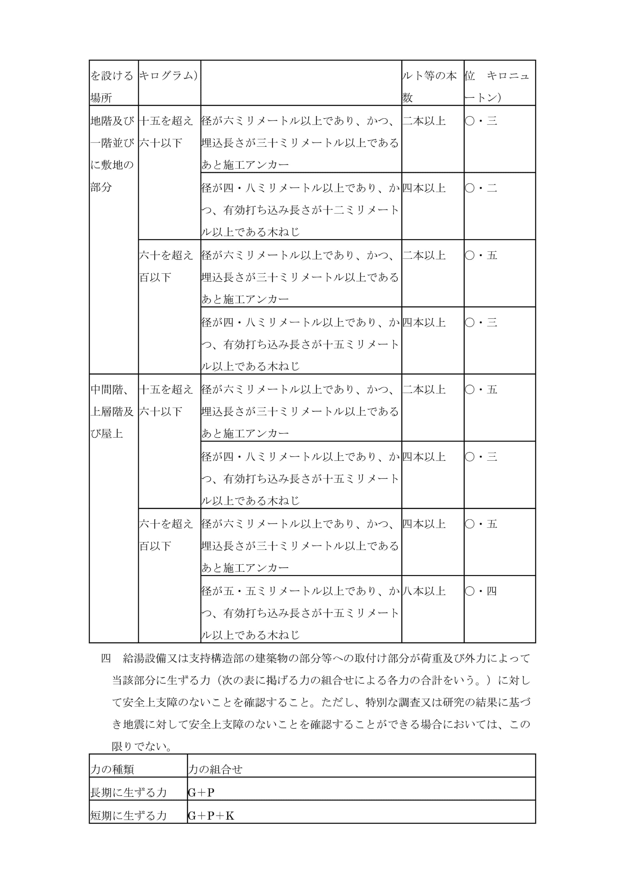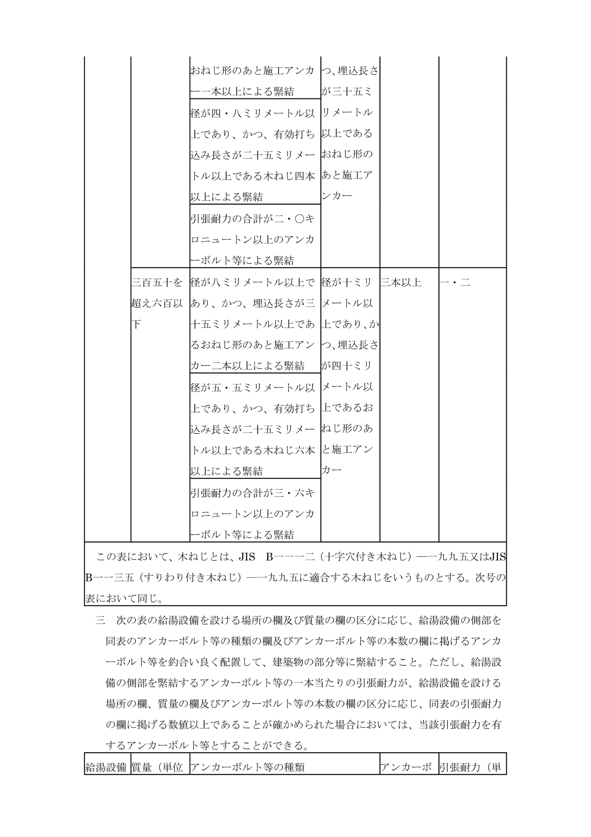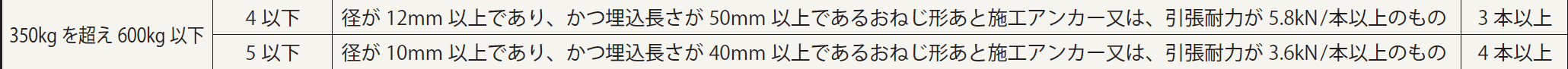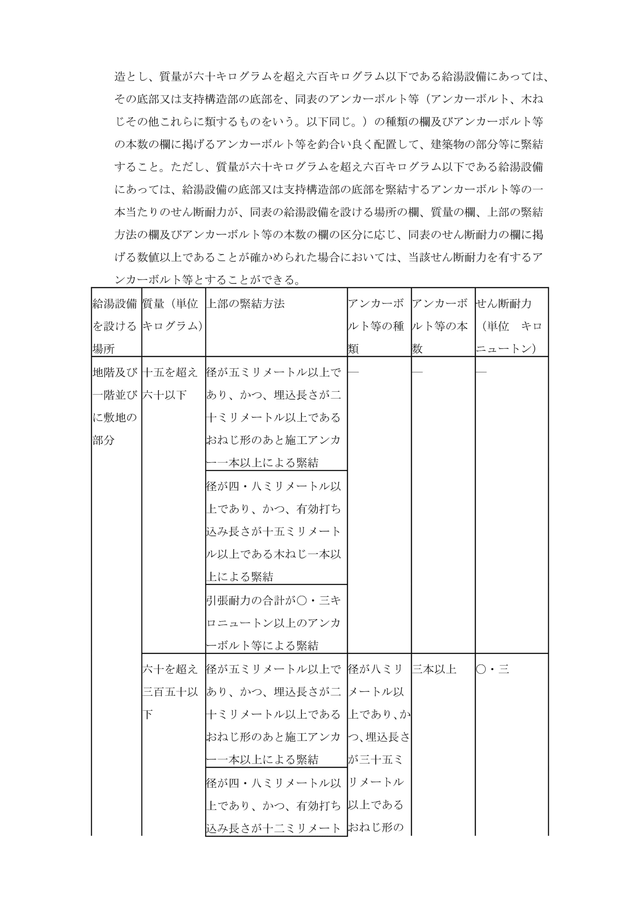 あのわかりにくい告示内容をズバッとまとめて、だれでもすぐに理解できるようにしたものです。例えば、エコキュートの脚の固定方法は、以下の表に規定されている内容になります。
