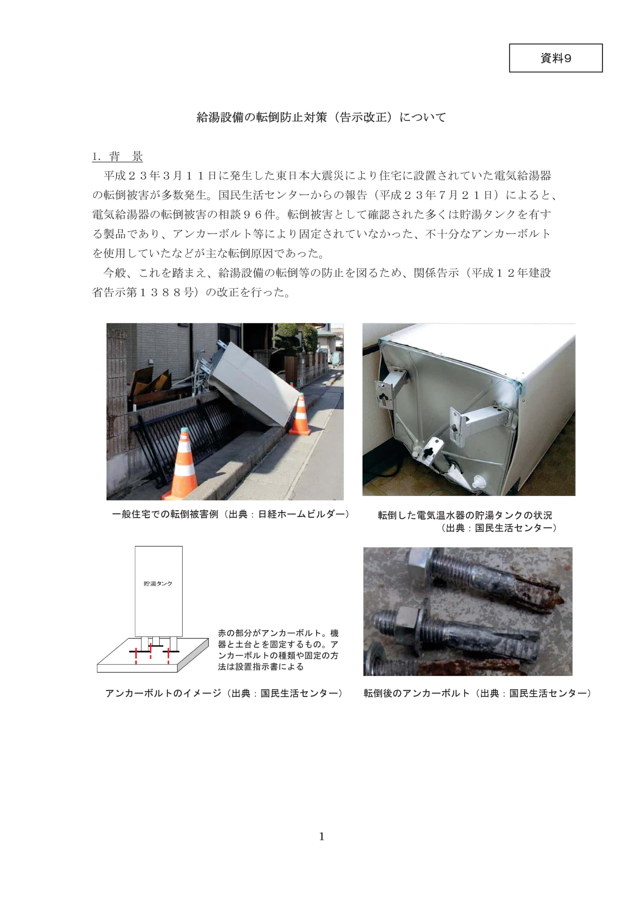 事の発端は「東日本大震災」です。この際、住宅に設置されていた電気温水器の転倒被害が相次いで発生していることから、その原因を調査し法的に規制することで対策としたわけです。また、注目度は電気温水器に集中していますが、付属物としての建築設備はほかにもあるわけですので、「建築設備全般への転倒防止措置」ということでの規制となりました。