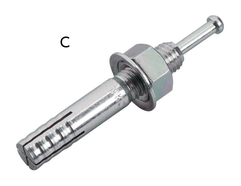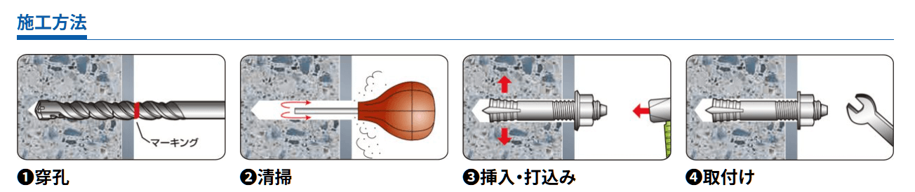 土間コンクリートに孔をあけて、このアンカーを差し込み、頭をたたくと割れている部分が内部で広がって止まるというものです。
