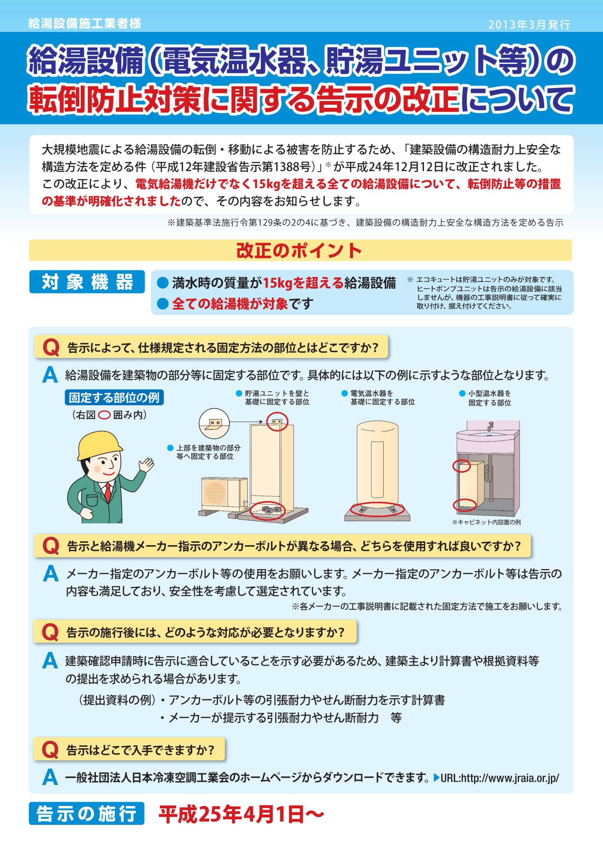 先ほども書きましたとおり、現場は大混乱で、その対応方法はどうしたらいいのか?というところで、設備関連の業界団体は対応に追われることになりました。例えば、電気温水器や小型給湯器、冷凍機、外調機などを扱う、「冷凍空調工業会」さん、「日本電機工業会」さん、などはわかりやすいリーフレットを発行して周知徹底をした経緯があります。