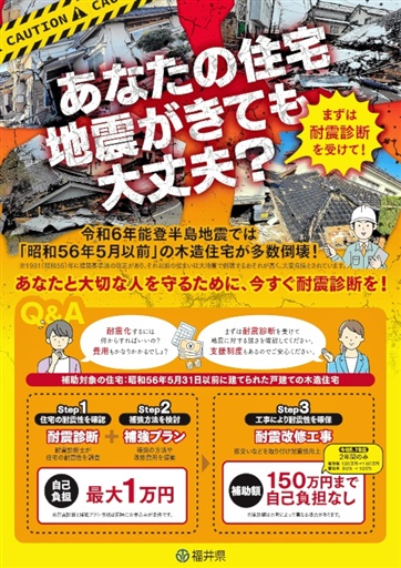 年初の能登地震の影響を受けて、結構な揺れを感じた福井県北部では「耐震性に関する問い合わせ」が急増し、その中でも、旧耐震基準の住宅の「耐震化」という部分では不安感もあって相談が相次ぎました。これを受け福井県では、耐震関係の補助金予算を増額し、各市町を窓口とした「耐震診断・補強プラン作成事業」を拡大したこと、さらに、改修工事に対する補助金額及び補助率を最大150万円、100%まで増額したことで対応をしました。