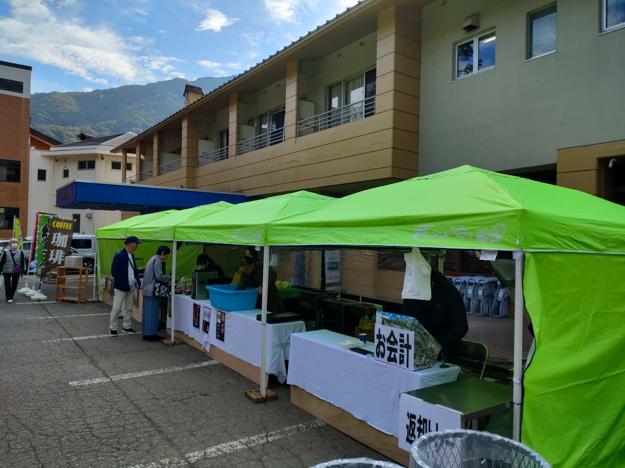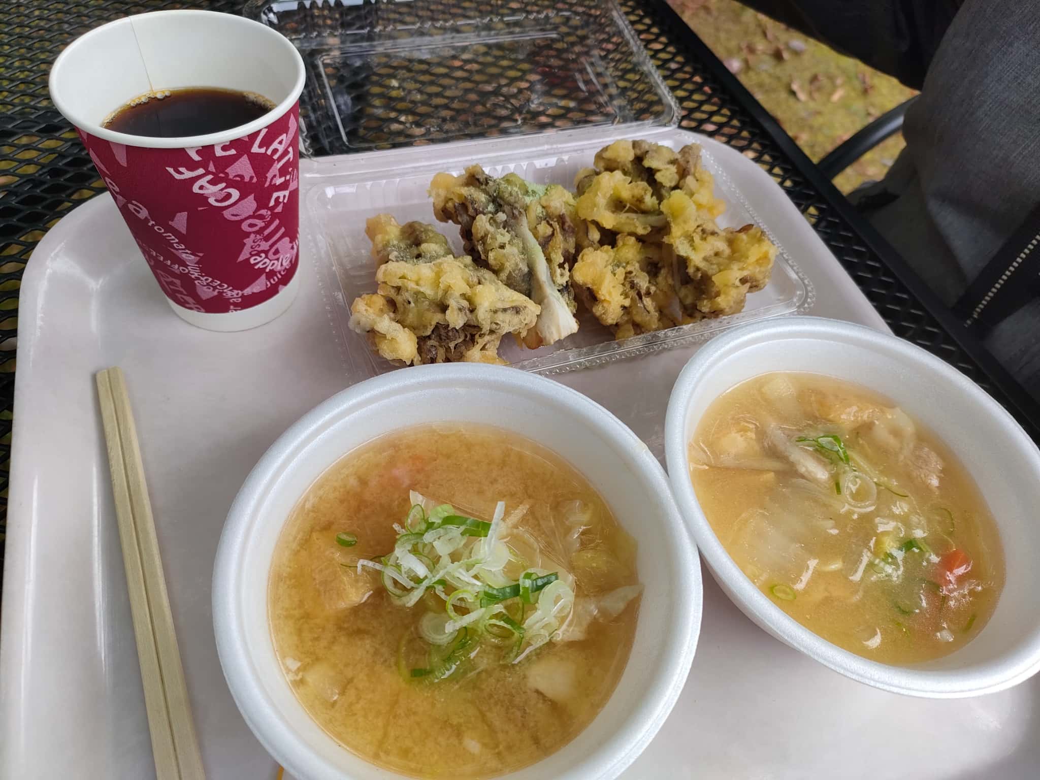 まずは、会場でもある「九頭竜パークホテル」さんが出す「豚汁」と「マイタケの天ぷら」と「コーヒー」ですw