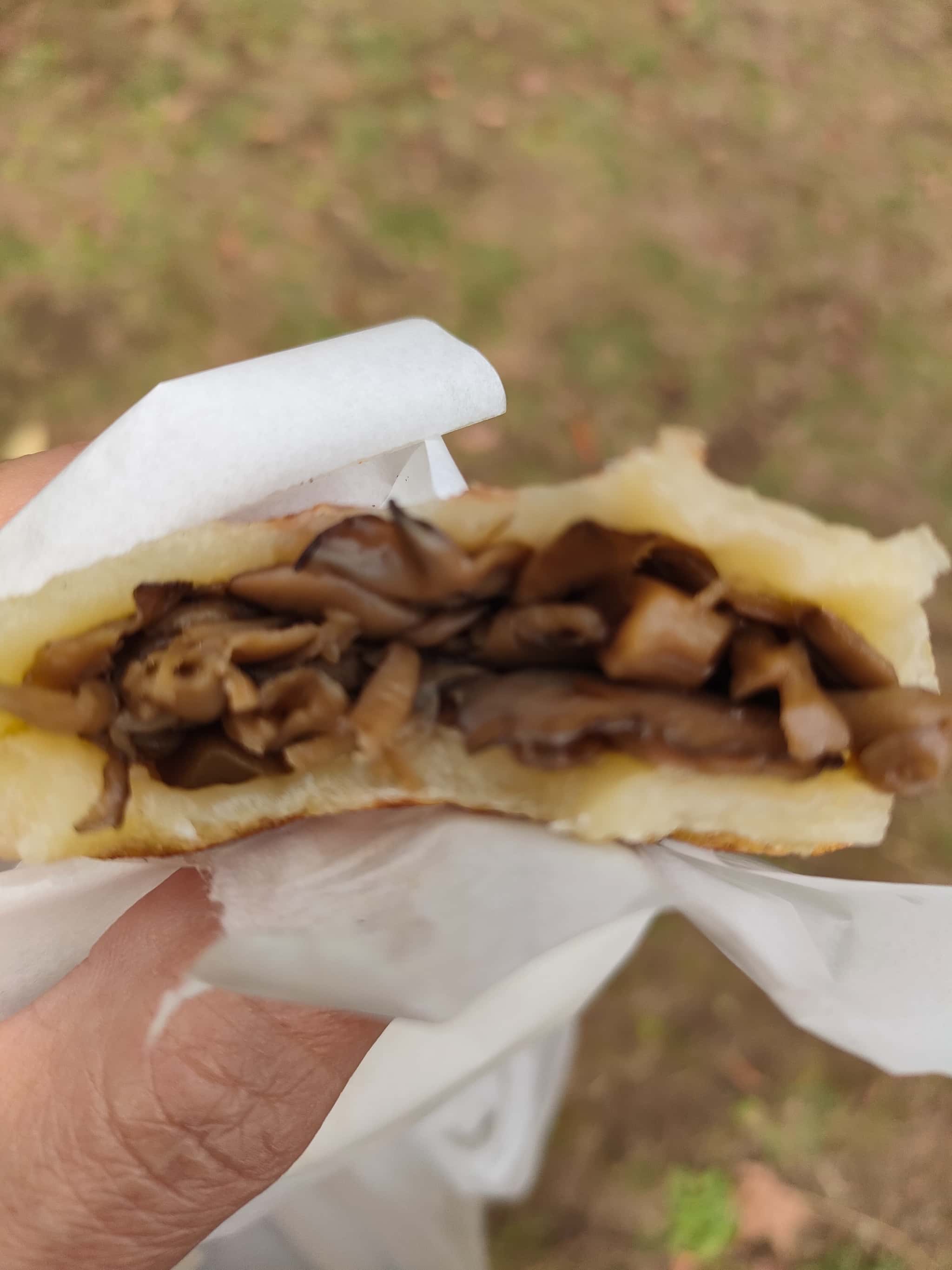 「おやき」というのは中にあんこが入っているのが普通ですが、「マイタケのおやき」は、中にあまじょっぱく味付けしたマイタケがはいってます。これがすごくおいしいのです。