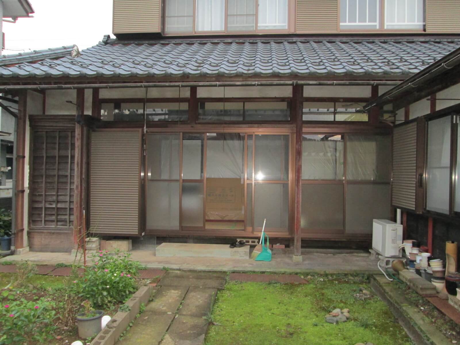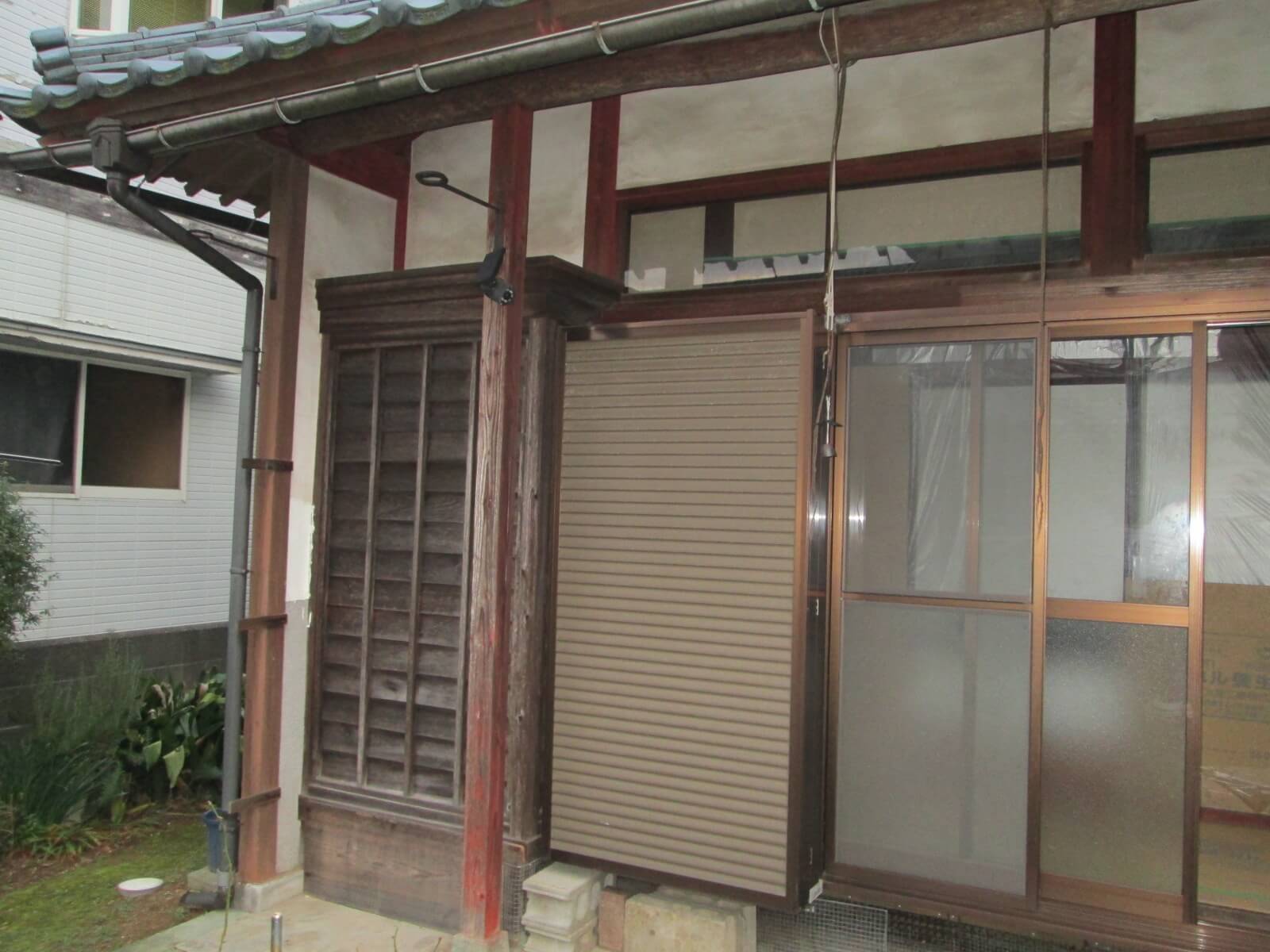 縁側のテラス戸はアルミサッシで、しかも雨戸付です。ランマ窓の部分をよく見ると「木製建具」です。おそらく新築したときにテラス戸も木製戸で、一番左に見える「戸袋」に雨戸がしまわれていたと推測できます。