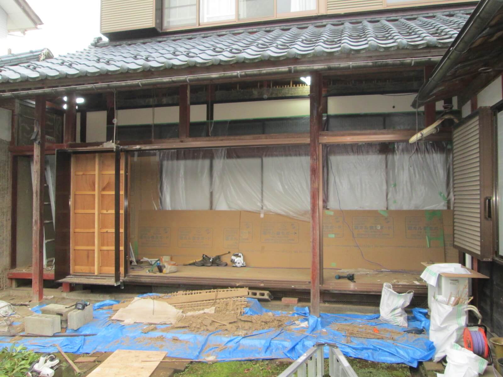 木製戸をアルミサッシに変えたときのやや新しい壁の構造も見えてきましたw 今回は、このやや新しい壁も壊して耐力壁にします。鴨居なども外して柱を追加します。