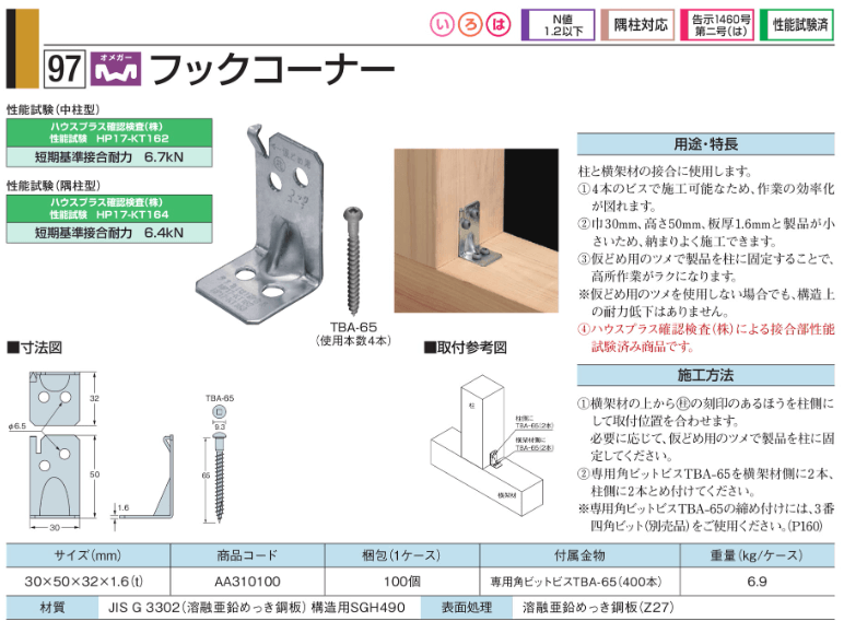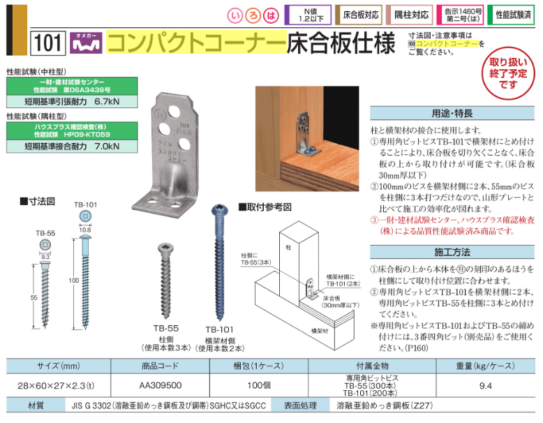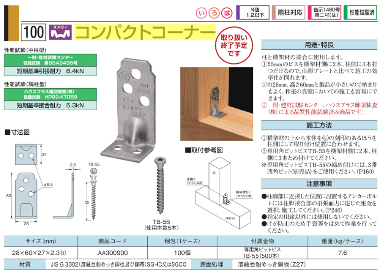 さて、「コンパクトコーナー」ですが、小さな金物なのに耐力は高いのです。小ささゆえに使い勝手もよく、耐力もそれなりにある金物として重宝していたわけで、これが廃番になるとなると、同等程度のものを探すしかありません。