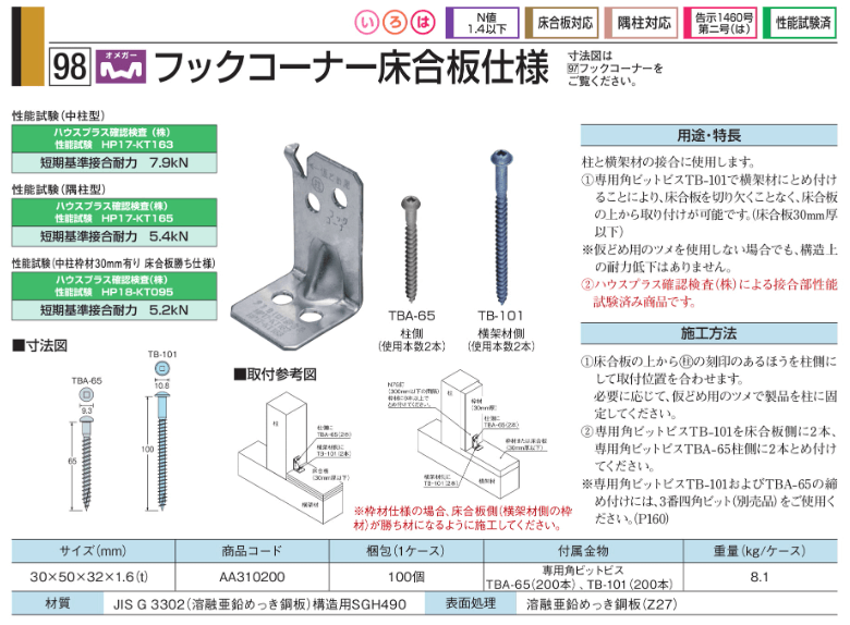 い、ろ、は等の記号は、それぞれ範囲のある耐力のどのランクに当てはまるか?というだけの指標で、同じ「は」の金物でも強度が違うわけです。例えば、コンパクトコーナーで設計している場合、このカタログに記載してある耐力を下回る金物を採用するというのは性能を下げるということになります。特に構造計算で柱の金物を選定している場合には、耐力を評価していますので、「は」だからということで同等とすることは原則できません。また、金物の耐力は設置される柱の位置によって変わります。カタログの「中柱型」とは壁の中間部分にある柱で、「隅柱型」は角柱にあたる柱で、耐力が違うわけです。また、取付を床合板の上から取り付ける場合と、直接、梁に取り付ける場合でも違います。弊社では設計上の扱いを合理的にするために、低い耐力で位置に関係なく耐力評価をしています。