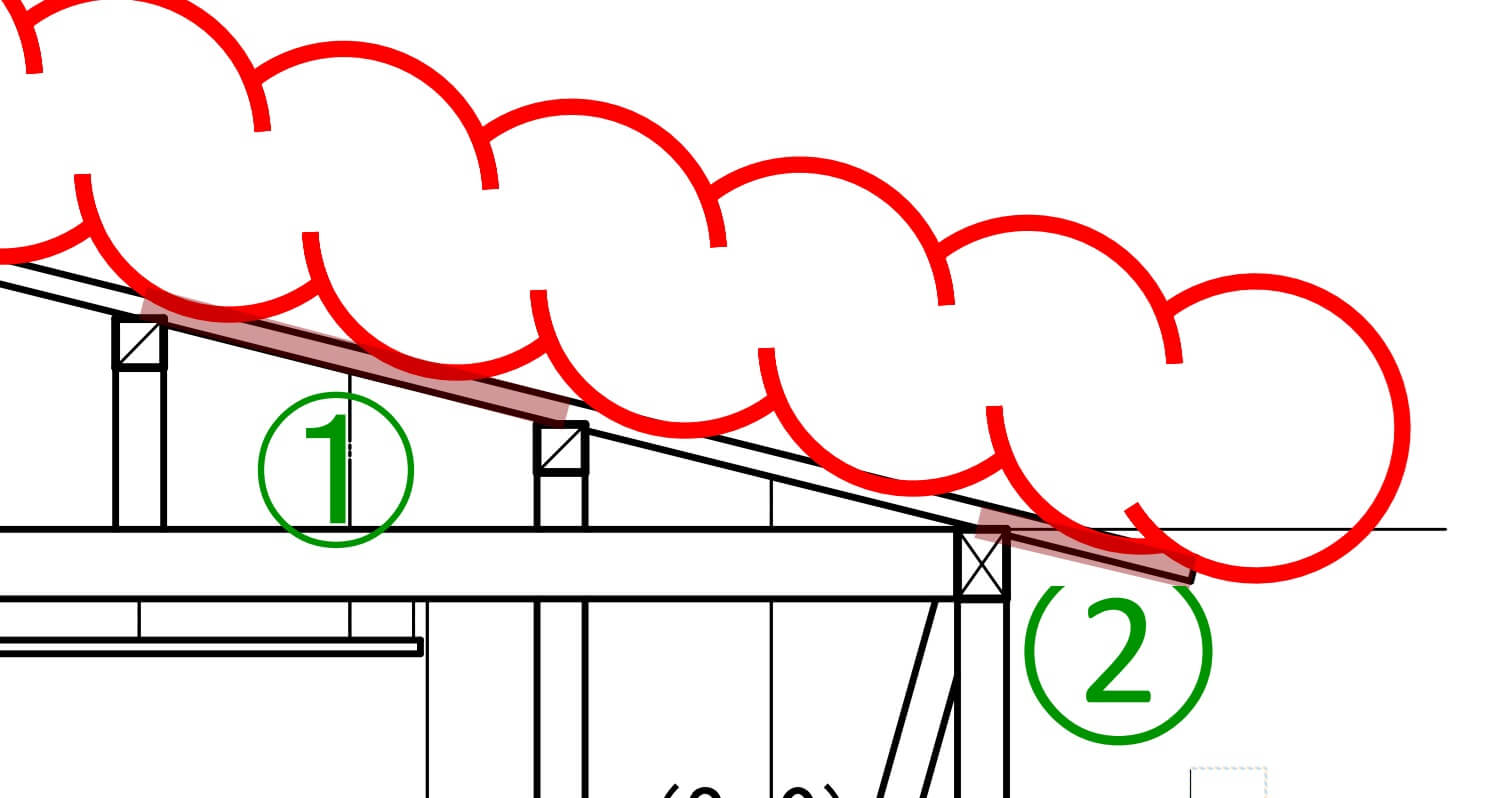 図には、①と②がそれにあたります。①は屋根の中央部分、②は軒先部分です。この①と②の間には非常に大きな力の作用の差があります。