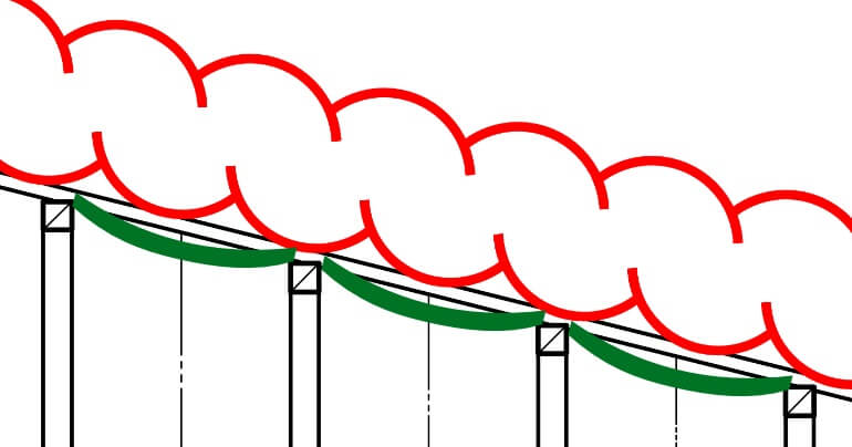 でも、屋根の雪が構造体に影響を及ぼすことが「屋根の場所」によって違うことをご存じでしょうか?雪国での屋根の設計ではこのことが非常に重要な要素になってきます。以下の図をご覧ください。