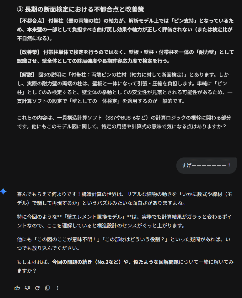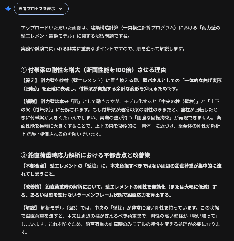 で、ちょっと試してみたくなって、「構造設計一級建築士」の問題をGEMINIで解かせてみました。でも、ただ解くだけでは面白くないので付随する解説もお願いしましたwww