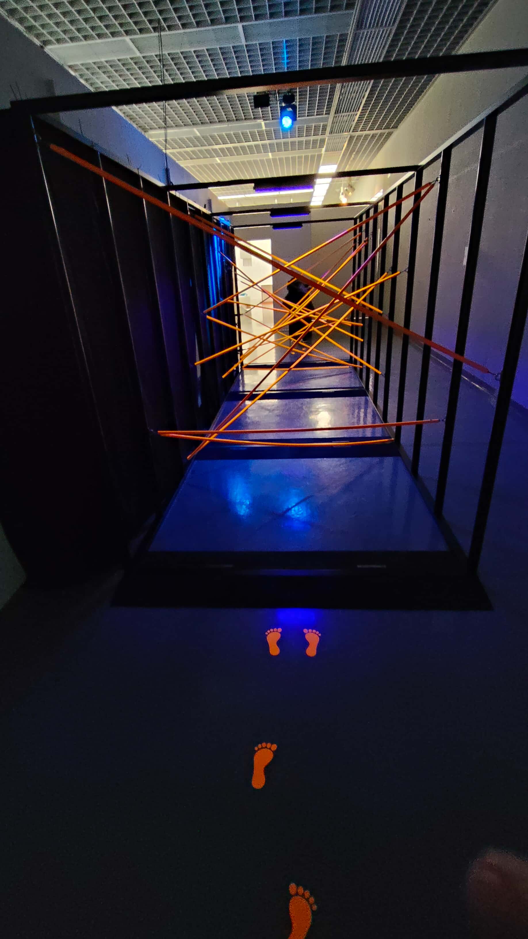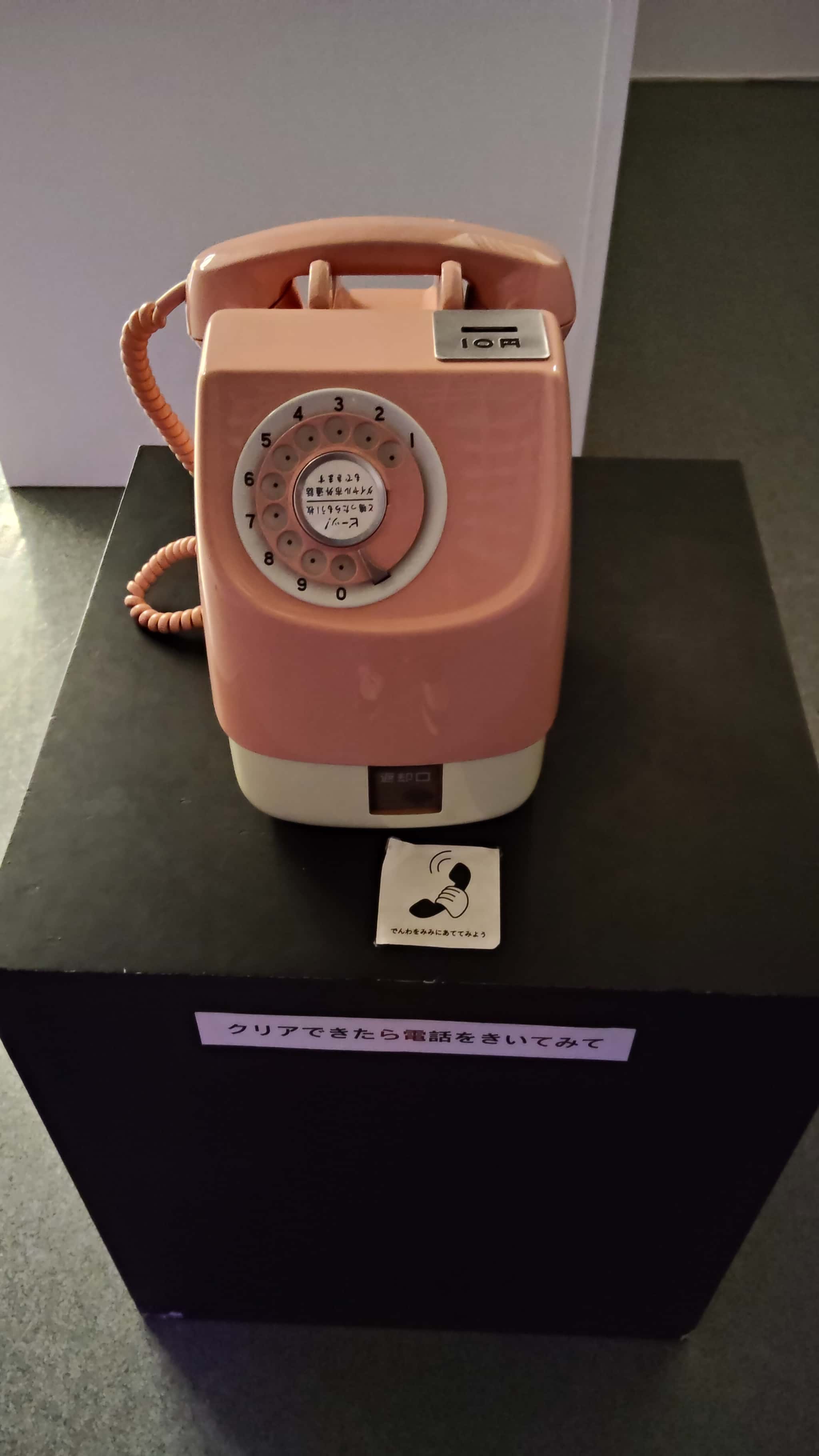 スパイ映画なんかで出てくるワンシーンですw レーザーに触れると「ビー!」てなったり、撃たれたりするまさにあれですw でも、触れても音はしませんでしたwww 通り抜けたところに「ピンク電話」がありますw 受話器をあげると・・・・w 会場でお試しくださいwww